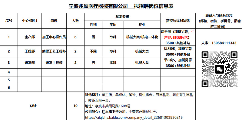 【岗位推荐】宁波兆盈医疗器械有限公司 ——招聘多部门岗位