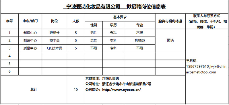 【岗位推荐】宁波爱诗化妆品有限公司 ——招聘多部门岗位