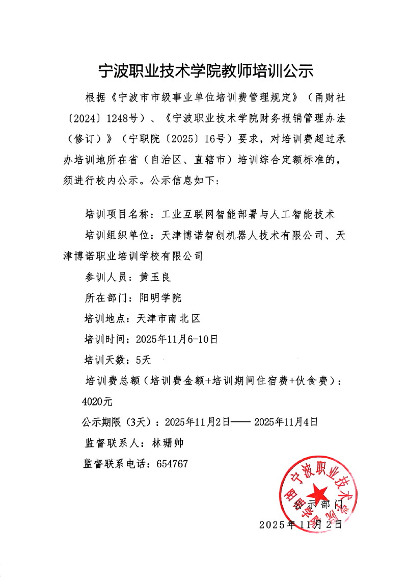 宁波职业技术学院教师培训公示内容--工业互联网智能部署与人工智能技术