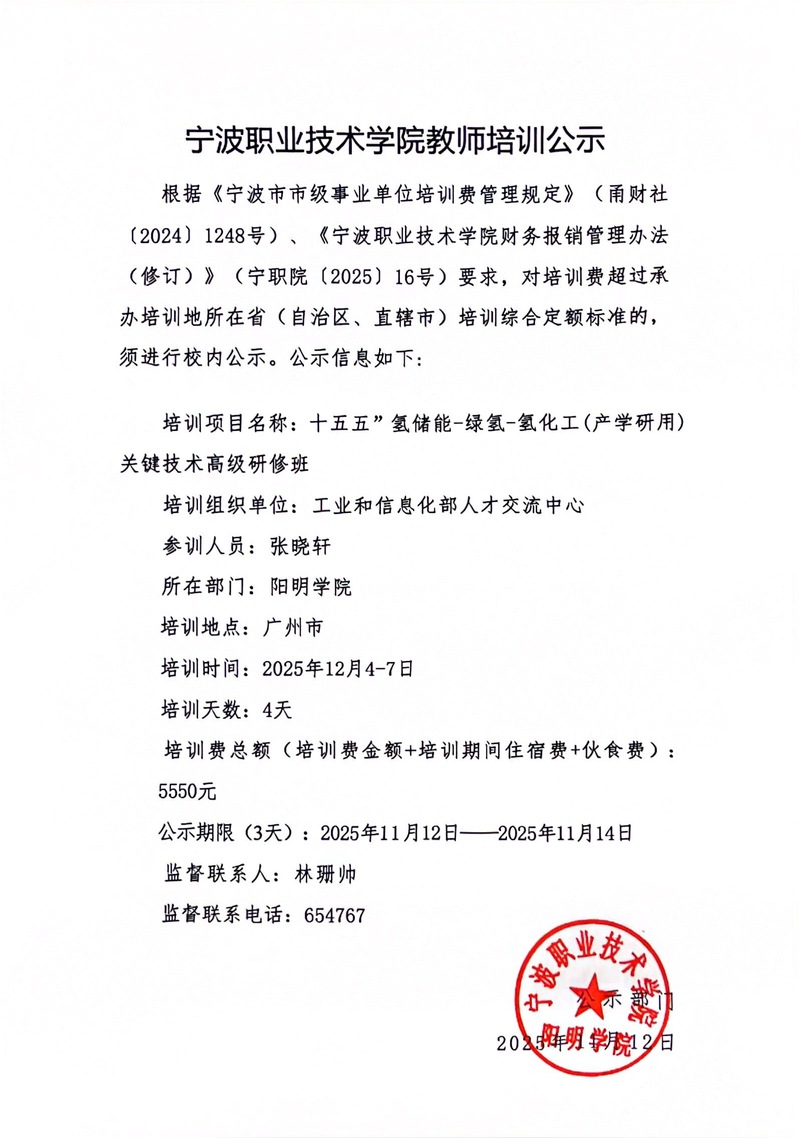 宁波职业技术学院教师培训公示内容--“十五五”氢储能-绿氢-氢化工(产学研用)关键技术高级研修班