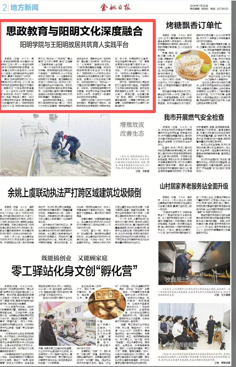 阳明文化的育人成效不仅体现在校园内,更辐射到广阔社会。阳明学院学生志愿者团队定期走进社区、中小学,开展阳明文化宣讲、专业作品展示等活动,“姚”青春志愿服务每年惠及居民千余人。“这是传统文化创造性转化的生动实践。”市文保所副所长黄懿表示,“学院将心学智慧转化为育人资源,故居提供实践平台,这种双向赋能模式具有示范意义。”