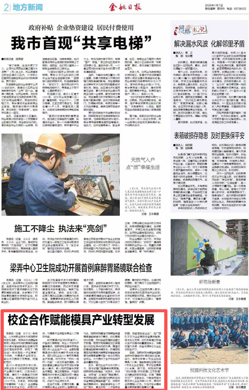 自2010年在我市办学以来,宁波职业技术大学阳明学院坚持以产业需求为牵引,以技术迭代为支撑,建成了一批高能级科研与服务平台,年度科研经费现已突破1000万元。多年来,学院与国家级专精特新“小巨人”企业锦隆电器逐步形成全方位、深层次协作,为模具产业转型发展注入了强劲动能。