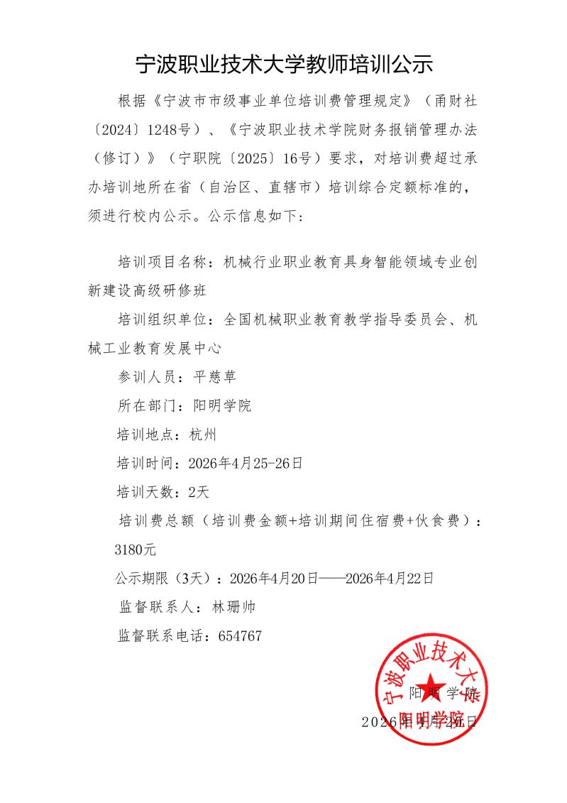 宁波职业技术学院教师培训公示内容--机械行业职业教育具身智能领域专业创新建设⾼级研修班